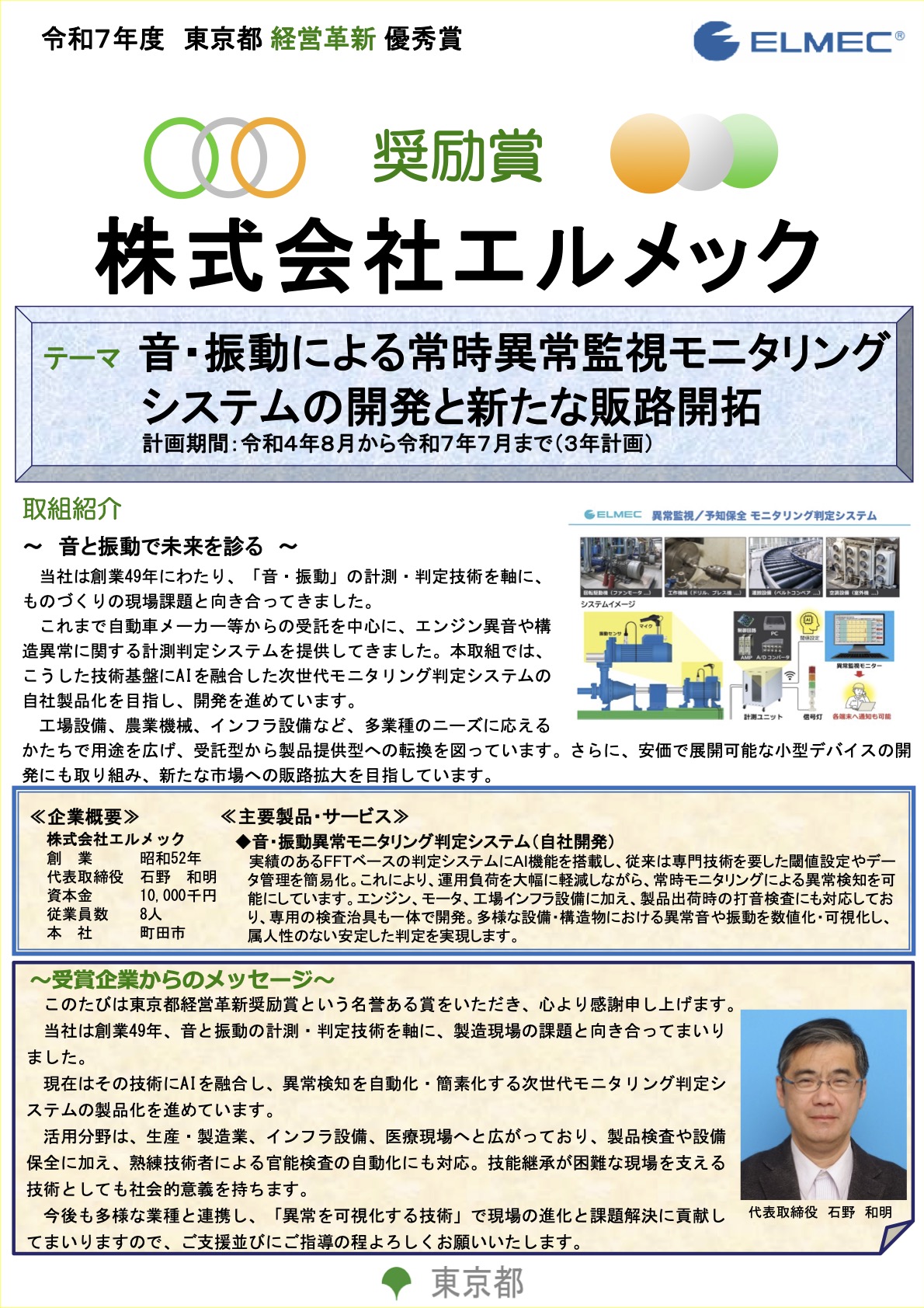 株式会社エルメックは、2025年度「東京都経営革新奨励賞」を受賞いたしました。